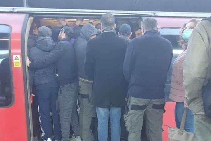 Натомість із Лондона повідомляють про натовпи пасажирів у метрополітені. Хоча з 20 березня було закрито 40 станцій, у ЗМІ та соцмережах публікують численні фото й відео переповнених вагонів метрополітену. Як видно з фото, маски носить абсолютна меншість.