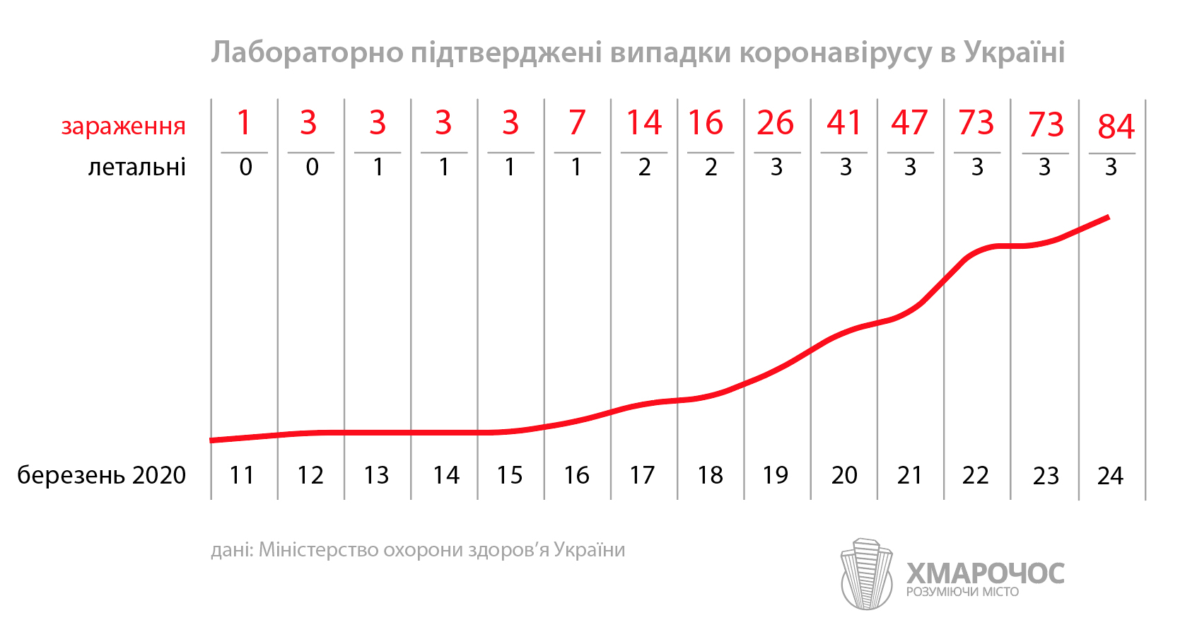 Станом на 10:00 24 березня в Україні зафіксовано 84 випадки коронавірусної хвороби COVID-19, повідомляє Міністерство охорони здоров’я.