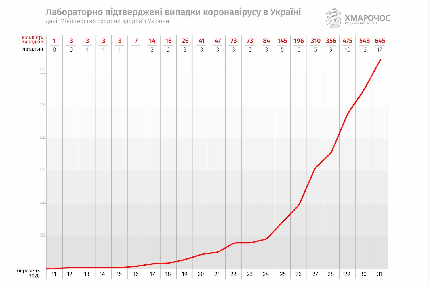 За даними ЦГЗ, станом на 22:00 31 березня в Україні 645 лабораторно підтверджених випадків COVID-19 ПЛР-дослідженням. Усього зафіксовано 17 летальних випадків від COVID-19 в Україні. За добу померло ще 4 людини.