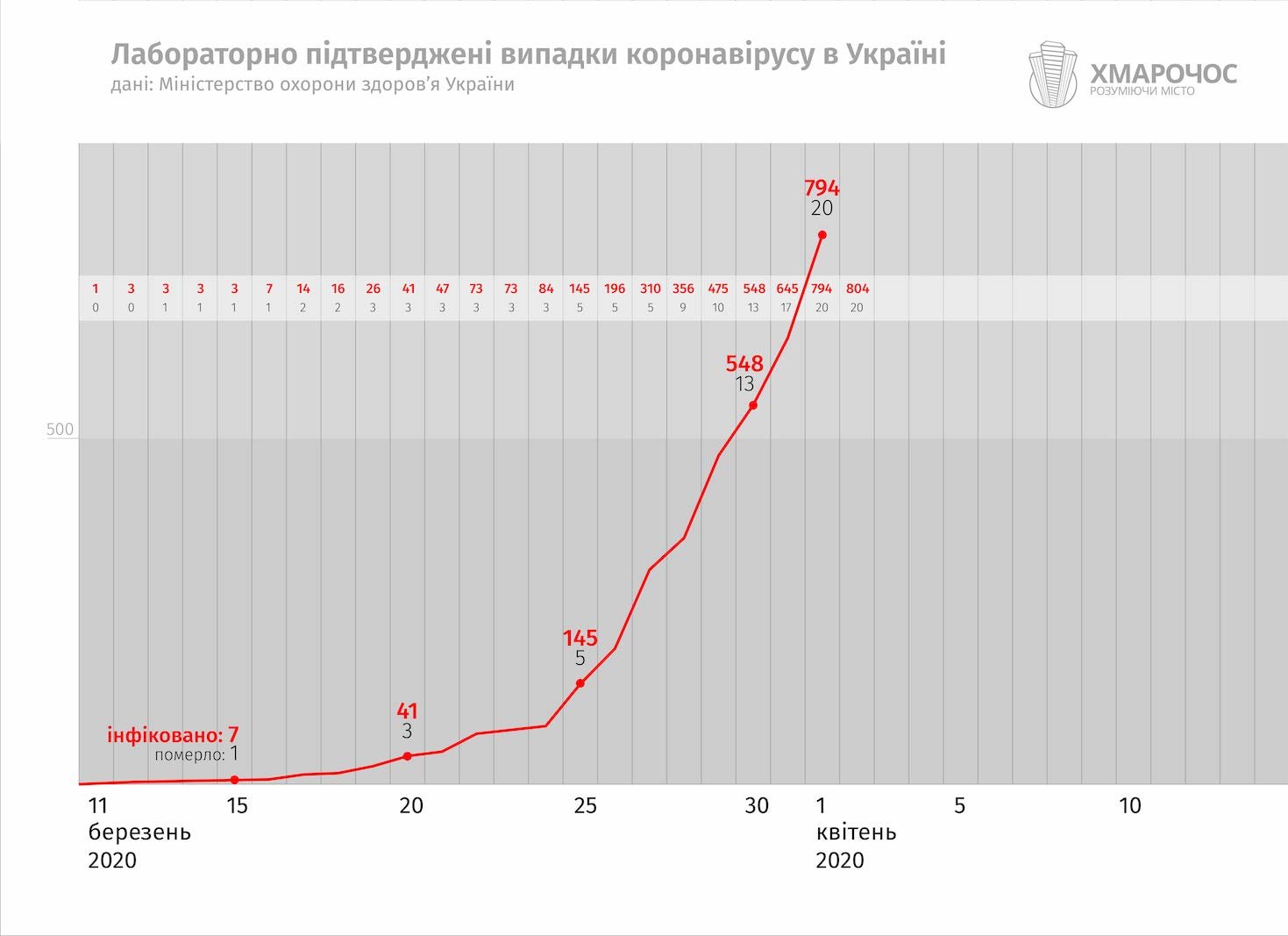 Станом на ранок другого квітня в Украні офіційно підтверджено 804 випадки коронавірусної хвороби COVID-19, 20 з них летальні, 13 пацієнтів одужало.