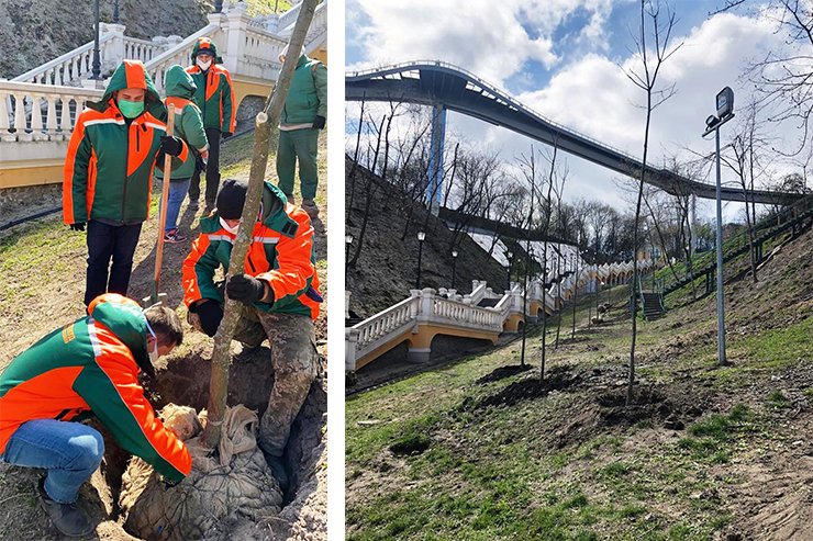 Працівники КП УЗН Подільського району з кінця березня почали висаджувати молоді саджанці замість зрубаних дерев на схилі біля пам’ятника Магдебурзькому праву, під новим велопішохідним мостом.
