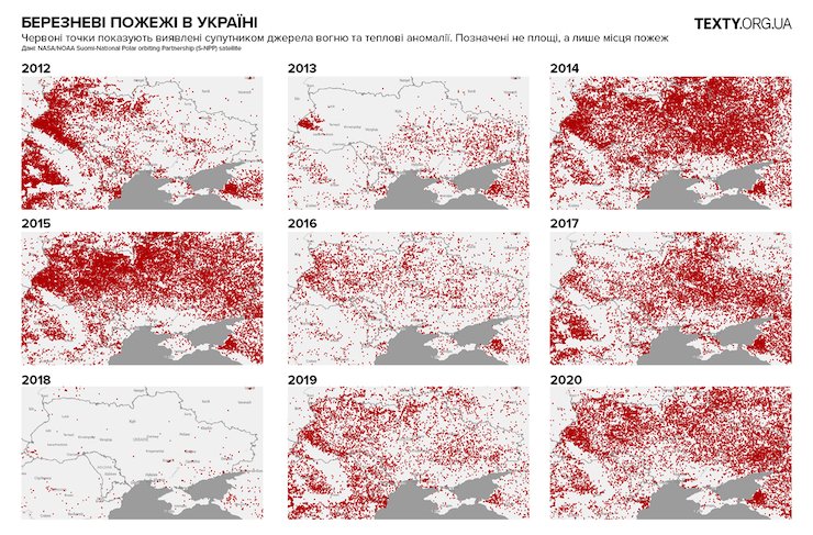 Кожної осені та весни українці палять сухе бадилля, стерню, очерети й усе навколо, включно з дикими тваринами. Та в попередні роки взимку випадало більше снігу (ця зима була зовсім безсніжною), у березні ще було волого. Зараз пожежам сприяє надзвичайно суха погода.