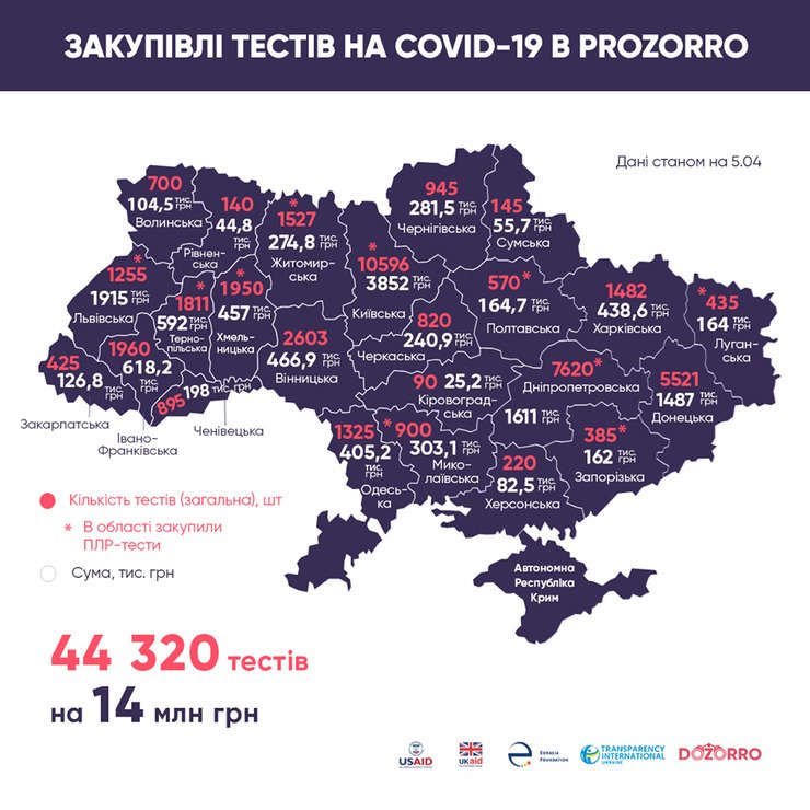 Станом на початок в Україні не лишилось області, яка б не закупила жодної тест-системи. Наразі найбільше тестів мають Київська область (понад 10 тис.), Дніпропетровська (7,6 тис.) і Донецька (5,5 тис.). Найменше їх у Кіровоградській (90 тестів), Рівненській (140) і Сумській (145) областях.