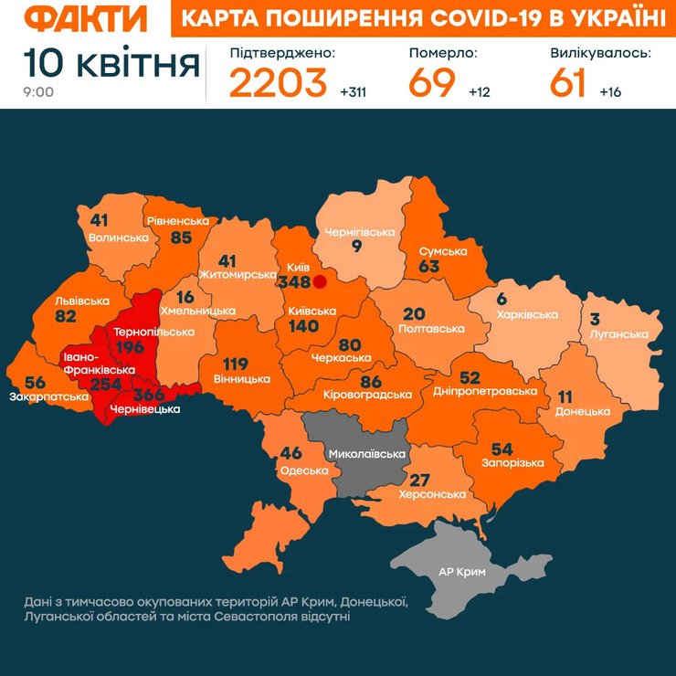 Станом на 9:00 десятого квітня, в Україні лабораторно підтверджені 2 203 випадків COVID-19, з них 69 людей загинули, 61 людина одужала. За останню добу виявили 311 нових випадків захворювання, повідомляє МОЗ.