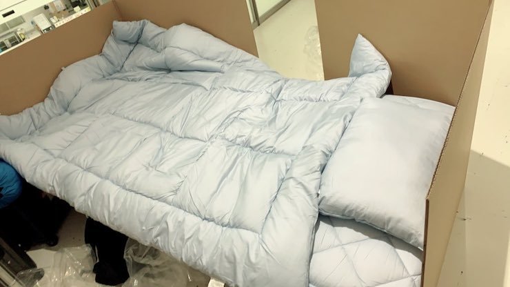 У картонні коробки поклали матраси та постіль. Утім, як сказав один із представників японського МОЗ, і як видно з фотографій, більшість імпровізованих ліжок не використовуються або використовуються на невеликий час.