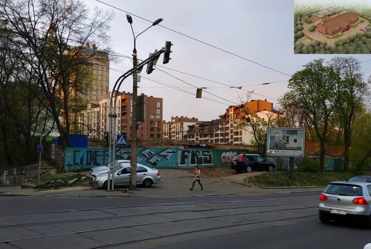 Ділянка скверу, огороджена парканом. Праворуч згори — єдина наявна візуалізація її забудови.
