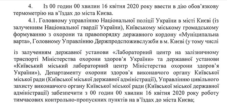 «З четверга, 16 квітня, до наступного понеділка ми посилюємо контроль на постах, виставлених на в’їздах до Києва. Зокрема, вводиться обов’язкова термометрія для пасажирів транспорту, що прямує в столицю. Це стосується автобусів, вантажно-пасажирського та легкового транспорту, що перевозить більше трьох пасажирів (включно з водієм)», – сказав Кличко.