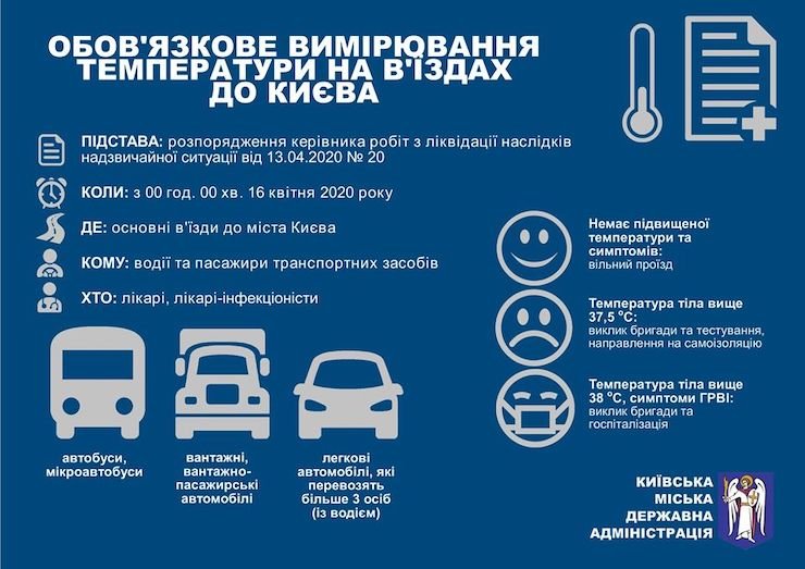 З 13:00 16 квітня на в’їздах до Києва водії та пасажири проходитимуть обов’язкову термометрію. Перевірятимуть автобуси, мікроавтобуси, вантажівки та легкові автомобілі, які перевозять більше двох пасажирів.