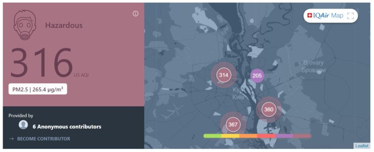 Також за даними світового порталу з визначення якості повітря IQAir.com, якість повітря у Києві сьогодні визначають як «небезпечну». Фахівці радать не виходить на вулицю та не відкривати вікна, натомість користуватися хатніми зволожувачами повітря.