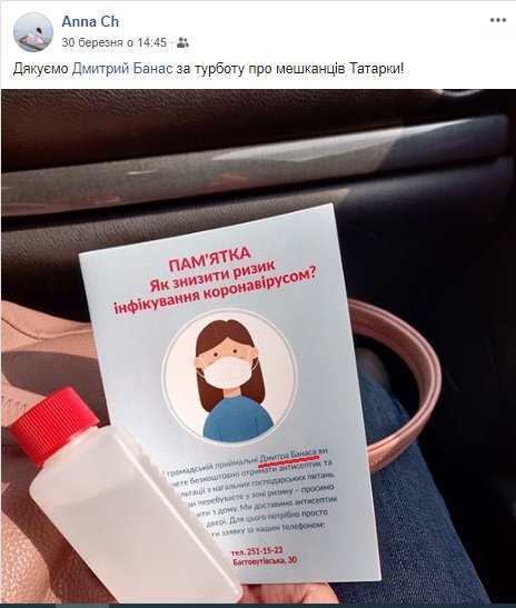 Депутат від БПП «Солідарність» Дмитро Банас роздавав антисептик із пам’яткою, що була підписана його ім’ям.
