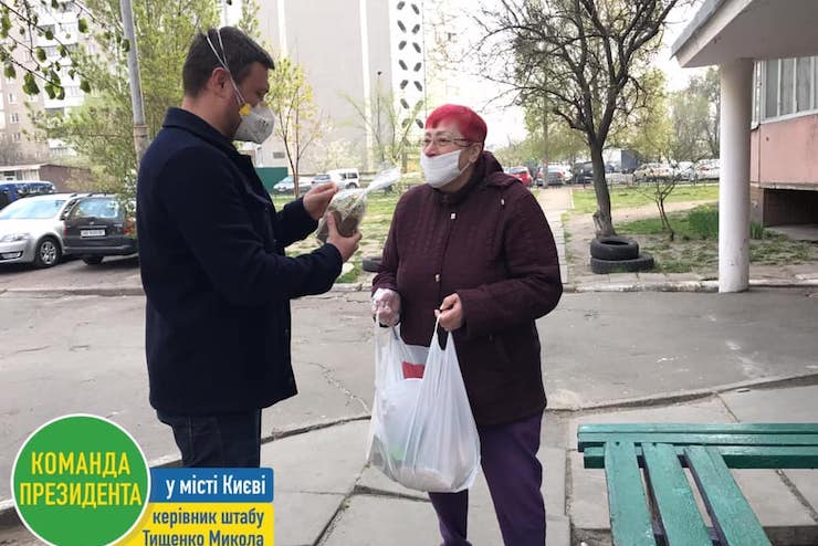 Микола Тищенко, депутат від «Слуги народу» так само особисто роздавав паски, харчі, маски, антисептики на Святошині та Борщагівці. Акцію проводили під хештегом #поділись_пасхою_з_ближнім.