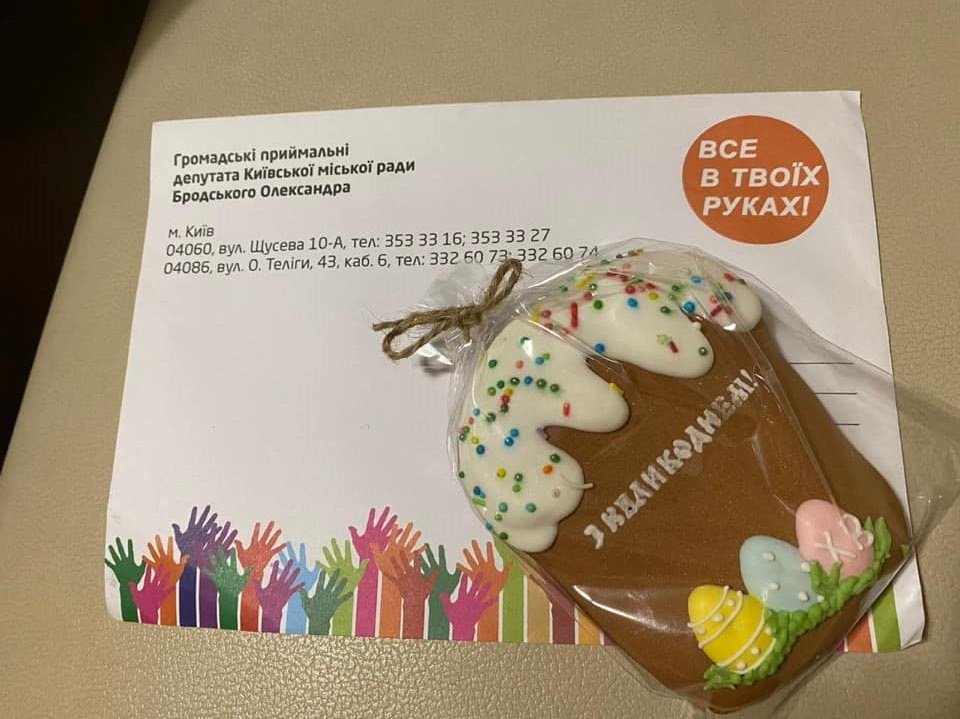 Депутат з фракції «Єдність» Олександр Бродський пригощав великодніми пряниками дітей в інфекційній лікарні. До пряників додавався конверт із прізвищем дарувальника.