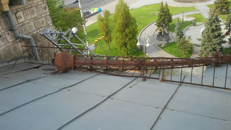 В суботу, 25 квітня, рятувальники КАРС вивезли шпиль, який впав на дах житлового будинку на Хрещатику. Фото були оприлюднені на сторінці служби порятунку в Facebook лише вчора.