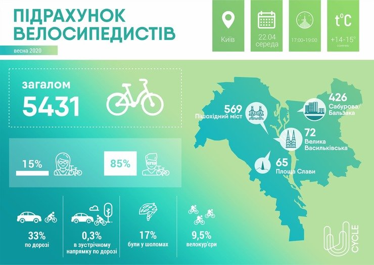 За підрахунками U-Cycle, під час карантину кількість велосипедистів у Києві зросла більш ніж у 2,5 рази, порівняно з весною 2019 року.
