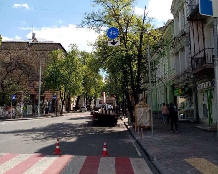 Перше фото: встановлений новий дорожній знак «Доріжка для велосипедів» на Ярославовому Валу, зі сторінки Департаменту транспортної інфраструктури КМДА у Facebook.