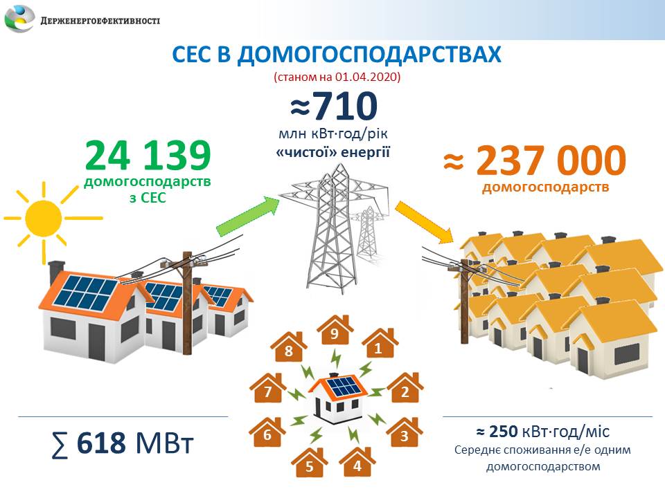 Загалом сонячні електростанції в Україні використовують понад 24 тисячі домогосподарств, загальна потужність сягає 618 МВт, а сумарний обсяг вкладених коштів – близько 500 мільйонів євро. Всі ці домашні СЕС можуть генерувати кількість енергії, якої достатньо приблизно для 230 тисяч родин.