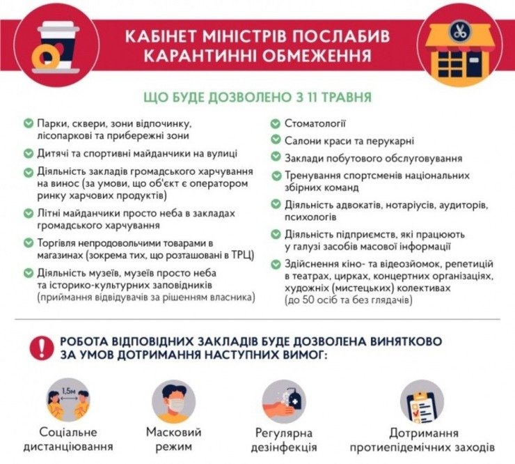 11 квітня відбудеться перше послаблення карантину. Уряд дозволив відкрити парки і сквери, дитячі та спортивні майданчики, стоматології, салони краси та перукарні, відновити діяльність нотаріусів, адвокатів, психологів, поновити роботу журналістів на вулицях і в органах держвлади, а також відновити знімання кіно, тренування спортсменів та репетиції в театрах і цирках.