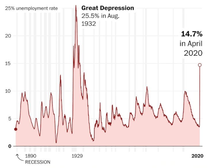За квітень 2020 року американська економіка втратила приголомшливі 20,5 мільйонів робочих місць. Це найбільший показник безробіття в країні після Великої депресії.