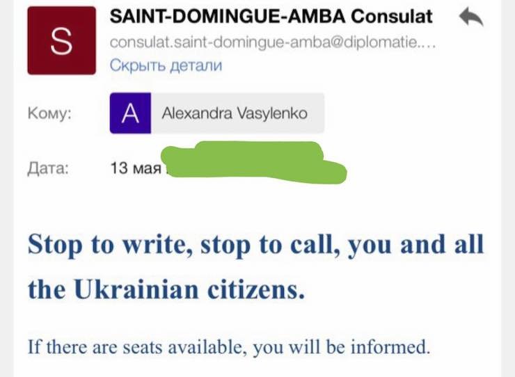 Так, шеф-кухар Євген Мензелевський, який застряг у Домініканській Республіці, днями опублікував скріншот відповіді французького посольства на прохання українських колег допомогти з евакуацією до Парижу: