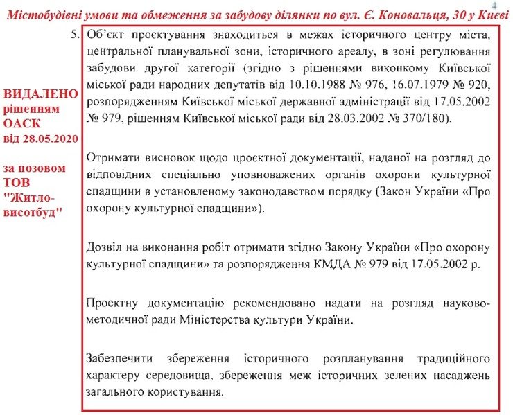 Окружний адміністративний суд м. Києва (ОАСК) рішенням від 28 травня скасував певні абзаци містобудівних умов та обмежень (МУО) по проєктуванню будівлі на вул. Євгена Коновальця, 30 у Печерському районі Києва. Вони зобов’язують забудовника отримати відповідні висновки від органів охорони культурної спадщини, зокрема, щодо граничної висоти новобудови, повідомляють Наші Гроші.
