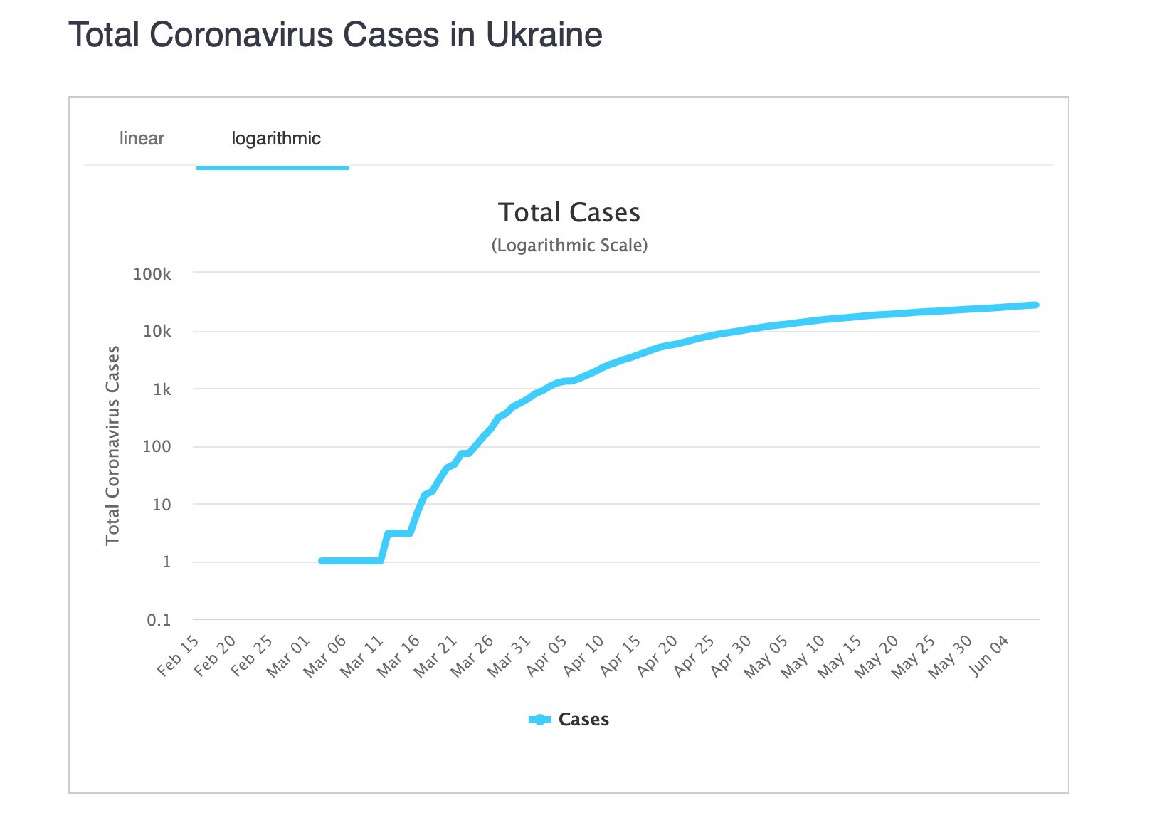 Логарифмічна крива випадків коронавірусу в Україні. Графік: worldometers.info