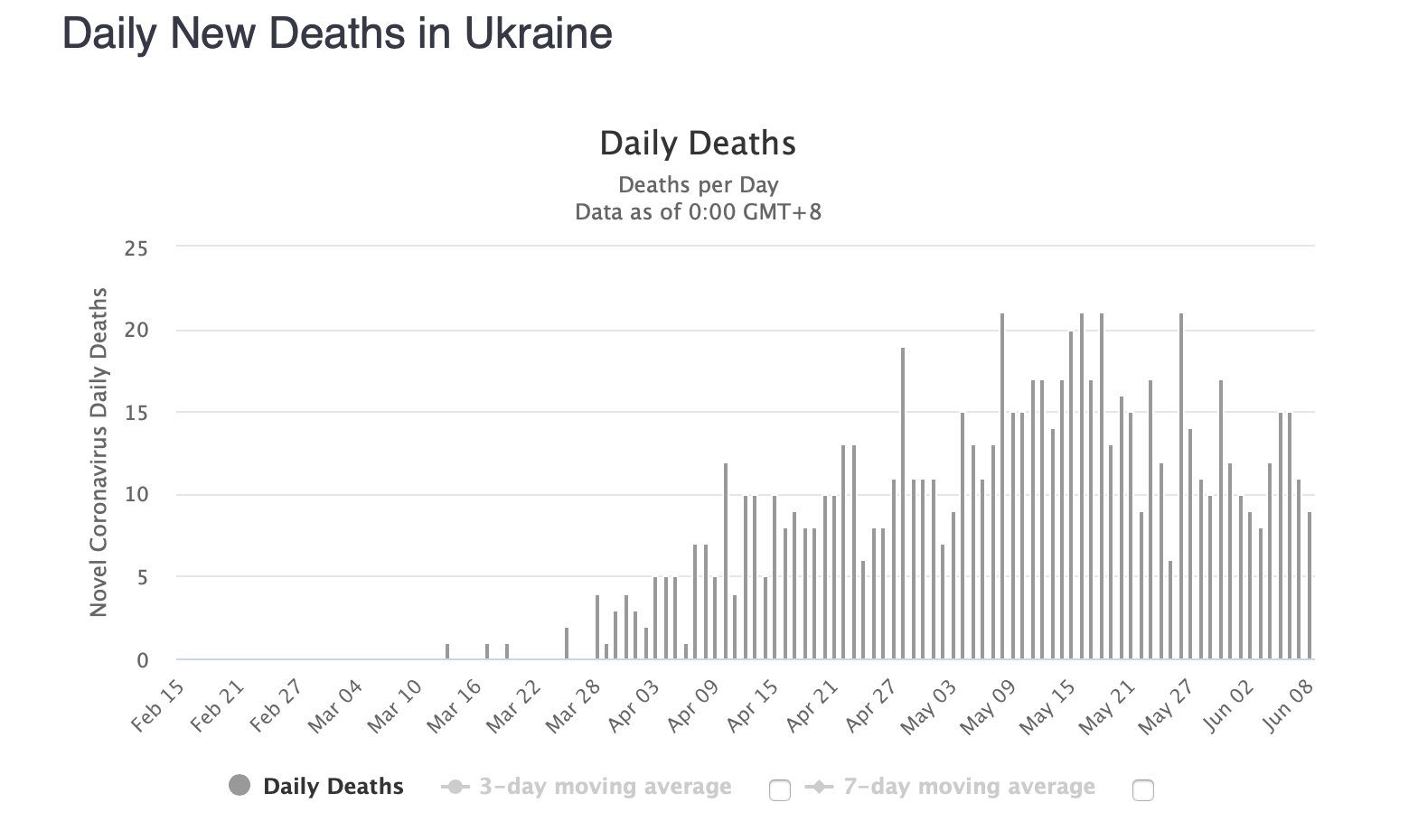 Кількість нових смертей за добу в Україні. Графік: worldometers.info
