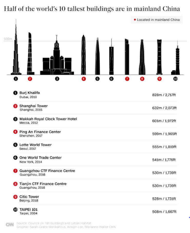 Наразі більше половини з десяти завершених проєктів висотної забудови понад 500 метрів знаходиться в Китаї.