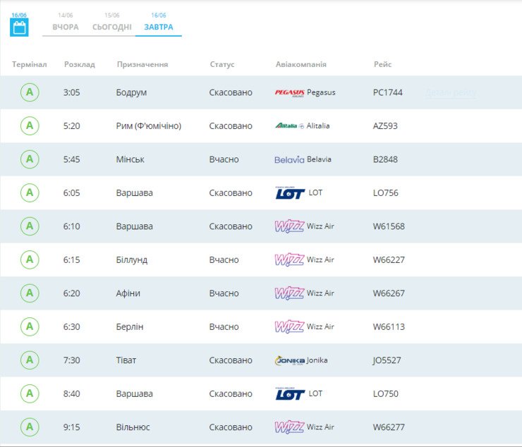Онлайн-табло аеропорту «Київ» на 16 червня