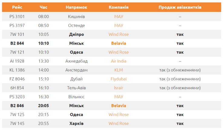 Онлайн-табло аеропорту «Бориспіль». Наголошується, що рейси МАУ в Кишинів, Остенде та Вільнюс не є регулярними і квитки на них не продавались