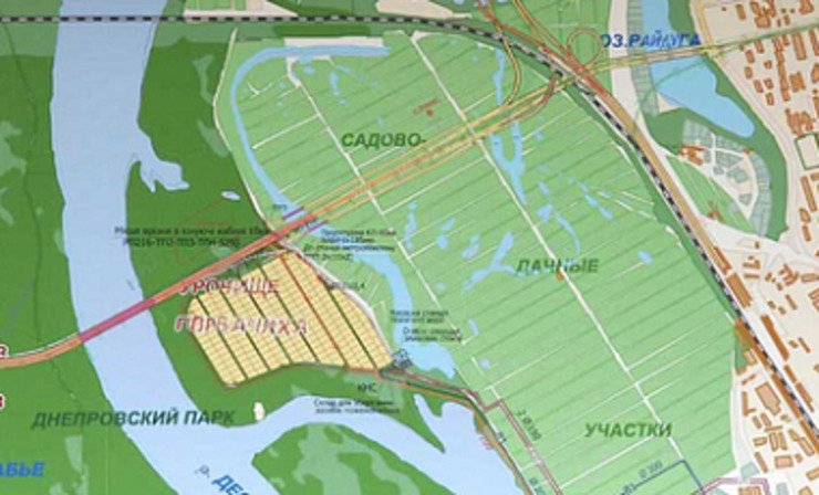 План-схема урочища Горбачиха біля ОСТ «Русанівський масив» та недобудований Подільсько-Воскресенського мість