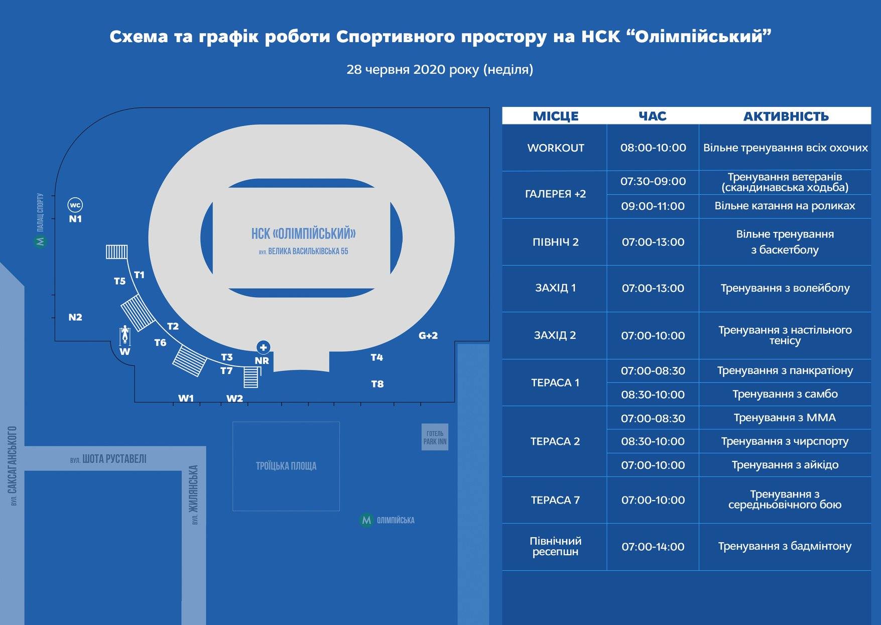 Спортивна зона та вільні тренування будуть доступні щодня з 8:00 до 20:00, крім днів проведення футбольних матчів.