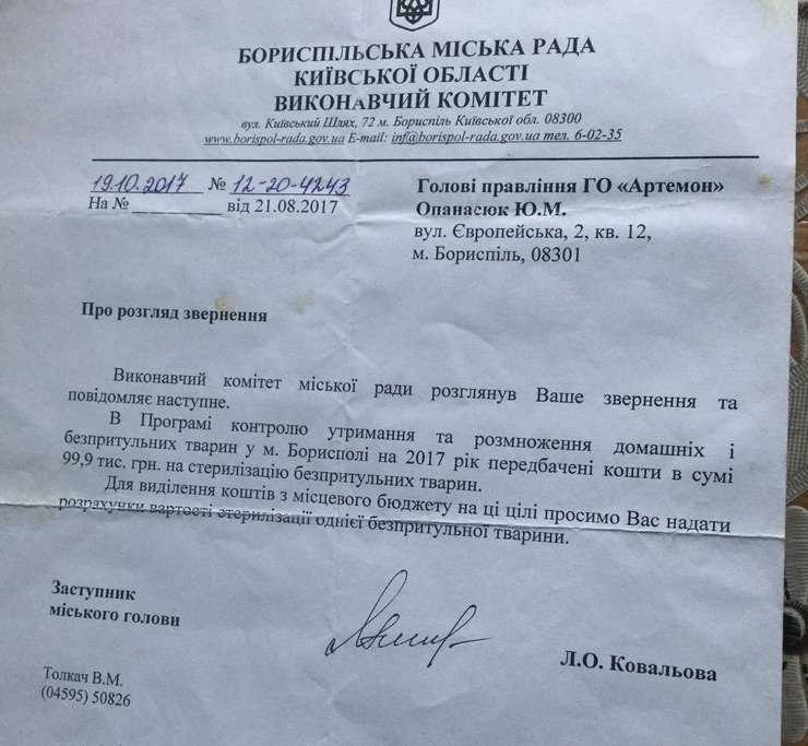 За словами волонтерів, фінансування на стерилізацію тварин у Борисполі почало надходити з 2017 року. Скрін копія надана Іриною Гах