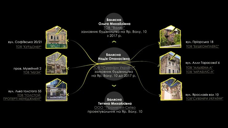 — Бенефіціаром цього неподобства виявилася родина Балясних, — пишуть дослідники. — Це три жінки, в активі яких мінімум шість будівель з подібною долею. Ольга, Надія і Тетяна Балясні — власниці фірм-замовників «реконструкції» на Ярвалу, 10 та інших об’єктах. Це ТОВ «Валяр» і ТОВ «Сувеніри України», а також фірма-підрядник з проектування «Прометей Сяйво» та ТОВ «Руст».