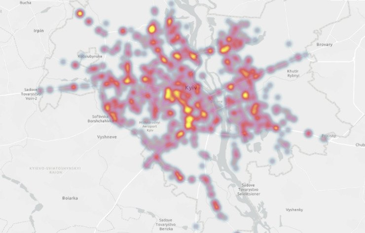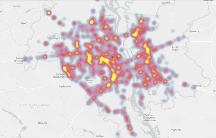 Карта щільності тяжких ДТП у Києві, де вказані лише ті ДТП, де є смертельні або тяжкі наслідки. З дослідження Іри Бондаренко