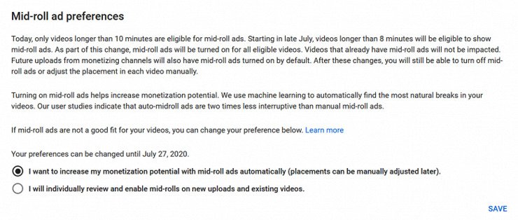 За чинними правилами, ролик має бути тривалістю мінімум 10 хвилин, щоб в нього можна було вставити «рекламну паузу». За новими правилами рекламу дозволять вставляти у відео тривалістю від 8 хвилин.