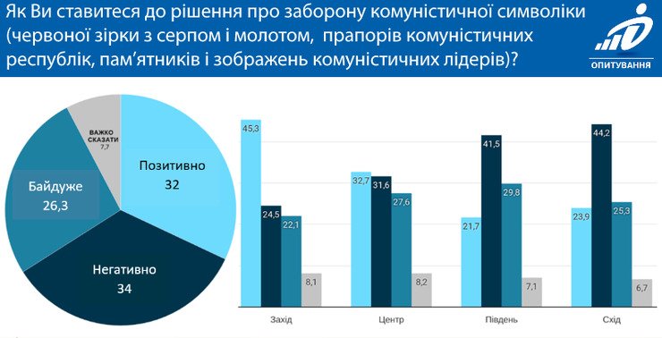 Заборону комуністичної символіки радше підтримують у Західних регіонах – 45% та Центральних – 33%, ніж на Півдні – 22% та Сході – 24%. Окремо зазначають, що серед молодших груп респондентів (до 40 років) більше тих, кого не цікавить питання заборони комуністичних символів.