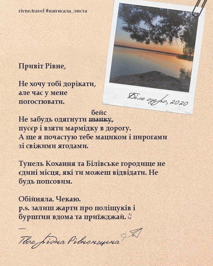 У Рівненській області запустили кампанію #написала_листа, яка має популяризувати туристичні локації Рівненщини, повідомляє сайт Рівненської ОДА. Зазначається, що це ініціатива команди «Рівненщина туристична» — оновленого туристичного бренду міста, який презентували у травні 2020 року.