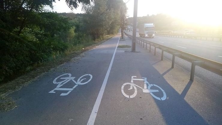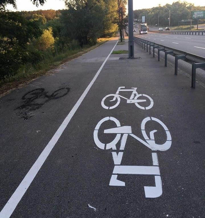 Велосипедисти звернули увагу дивну розмітку велодоріжки неподалік від ресторану «Верховина» на проспекті Перемоги. Фото опублікував кілька днів тому у спільноті «Білий велосипед» Олександр Яковецький.