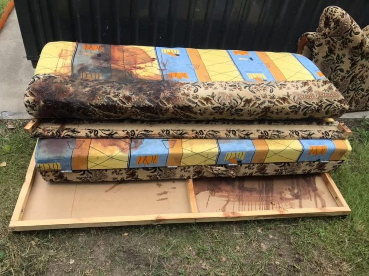 Скривавлений диван, на якому знайшли Олексія — і який майже одразу винесли на смітник. Фото: Олександр Чекманьов