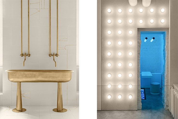 У зоні педикюру стіни та підлогу виклали світлою плиткою, яка подекуди має тріщини, інкрустовані латунню. Рукомийник зробили з двох дитячих ванночок радянських часів і пофарбували у золотавий колір.