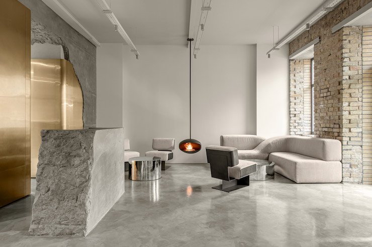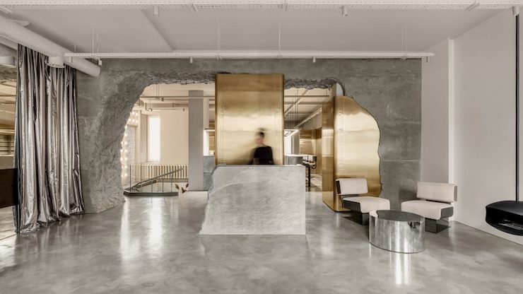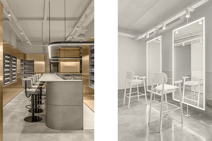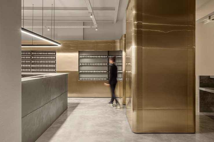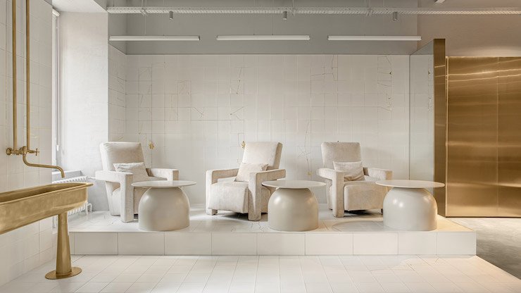 Бюро Слави Балбека вирішило відмовитися від гендерно маркованих деталей, які є звичайною річчю для салонів краси. Натомість інтер’єр зробили гендерно-нейтральним, з золотими акцентами, бежевими меблями і сірими бетонними поверхнями.