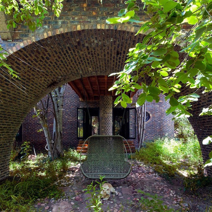 Видовжений відкритий коридор веде до цегляної тераси з вогнищем. На терасі також звели арку, до якої підвішено гойдалку.
