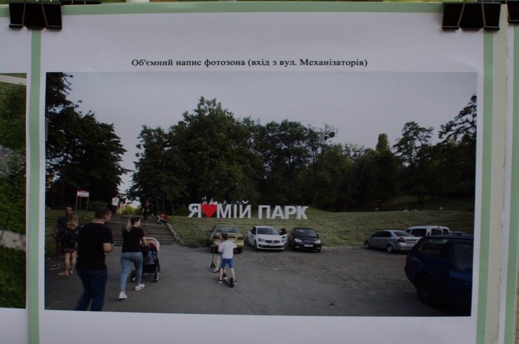 Напис при вході з вулиці Кудряшова на візуалізації проєктанти взяли з парку на Троєщині, у Солом’янському ландшафтному він буде іншим. Зовсім без літер обійтися не вдасться – за словами активістів, які презентували проєкт, це особисте прохання міського голови Віталія Кличка.