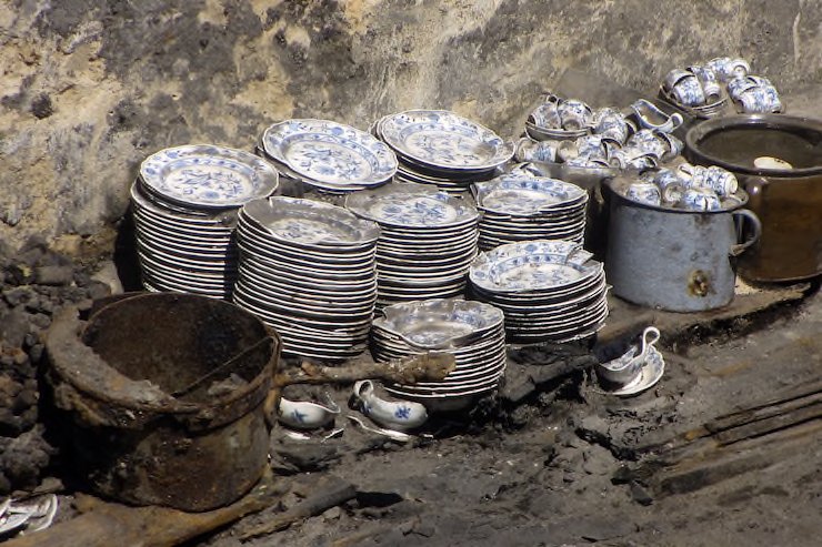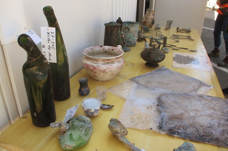 У підвалі-бомбосховищі археологи виявили посуд – винні пляшки, деформовані вибухом, горщики, чашки та тарілки з Майсенської порцеляни.