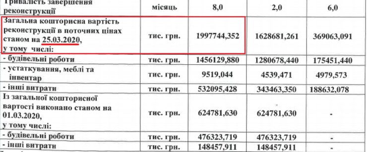 Відповідно до експертизи проєкту у березні 2020 року, яка є в розпорядженні Руху ЧЕСНО, вартість робіт наблизилася вже до двох мільярдів гривень.