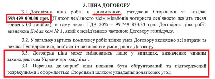 598 мільйоні 499 тисяч гривень – така ціна реконструкції згідно з основним договором за тендером. Відповідно до документу всі роботи з реконструкції і благоустрію мають закінчити до червня 2019 року. Водночас у договорі сказано, що «договірна ціна робіт є динамічною». Це і створює можливість для підвищення вартості.