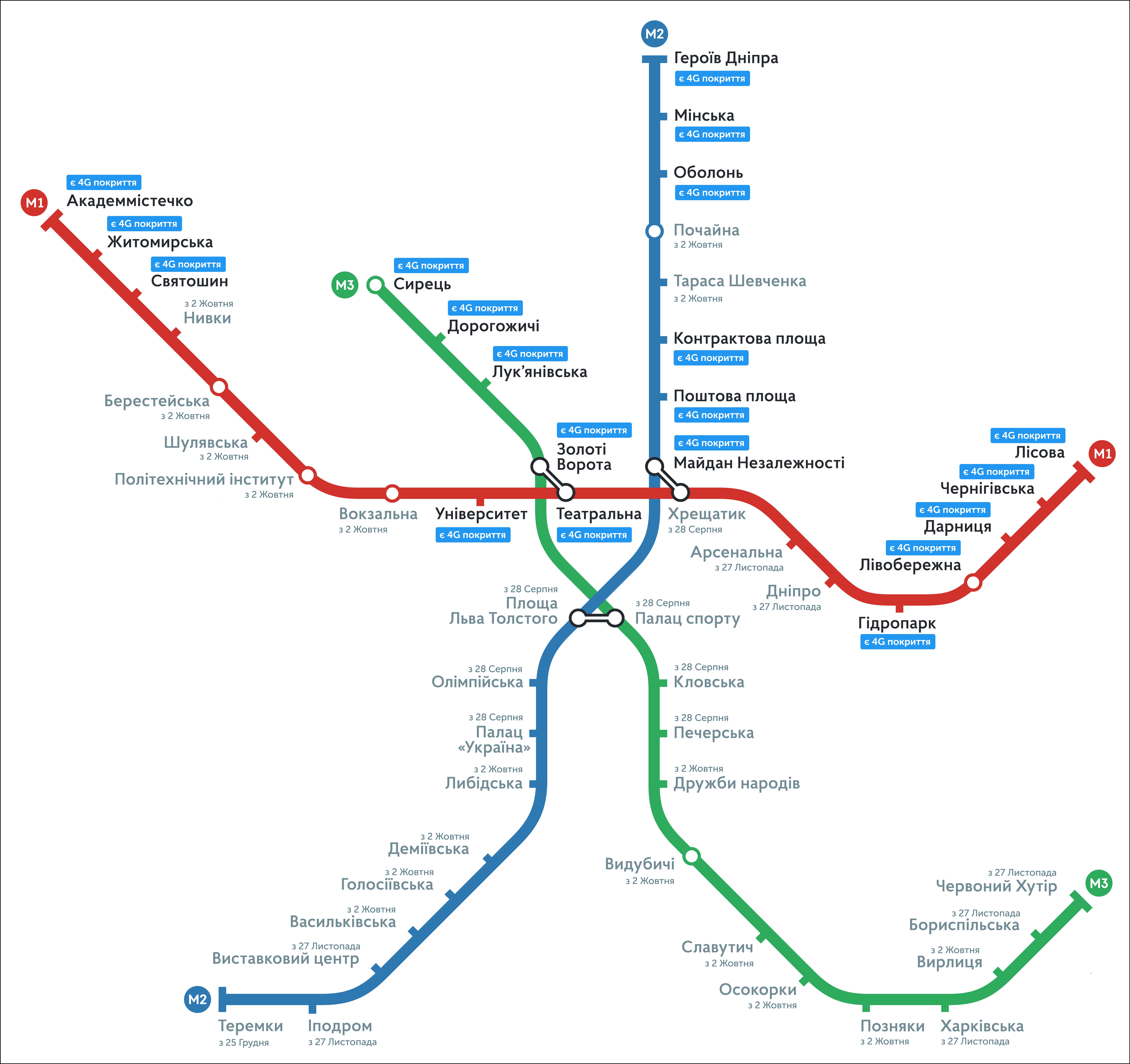 Мобільний інтернет 4G запустили ще на шести станціях київського метро та в тунелях між ними: «Університет», «Театральна», «Контрактова площа», «Поштова площа», «Майдан Незалежності» та «Золоті Ворота», повідомляє Міністерство цифрової трансформації.