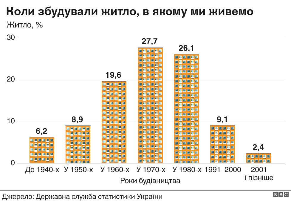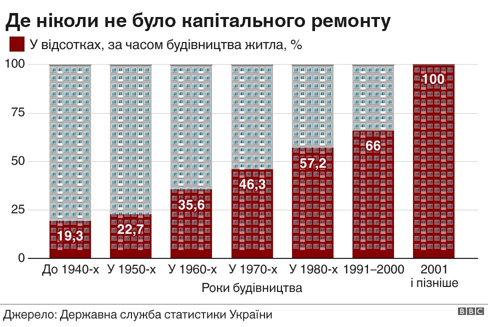 В Україні капітального ремонту ніколи не проводили у майже 45% житла, повідомляє ВВС News Україна. Зокрема, інфографіка свідчить, що не ремонстувалися майже половина будинків, зведених у 1970-80-х роках.