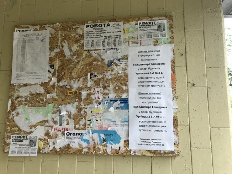 Спостерігачі ОПОРИ помітили оголошення на під’їздах будинків на вулиці Урлівській (22 виборчий округ, Дарниця) яке повідомляє, що за сприяння депутата Київради Володимира Гончарова біля їх будинку встановлено спорткомплекс. Підтвердження цьому є на сторінці Гончарова у Facebook. В коментарі він зазначив, що «спорткомплекс вставили за рахунок столичної програми соціально-економічного розвитку на 2020 рік», тобто за кошти з міського бюджету.