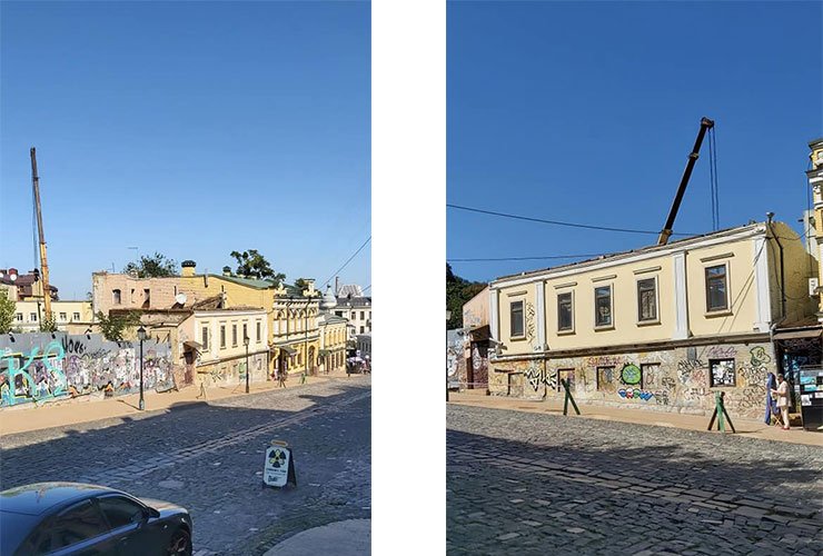 У будинку за адресою Андріївський узвіз, 10а вже демонтували дах. За попередньою інформацією, більшість будинку планують розібрати, залишивши лише фасад. Про це у Facebook повідомляє киянин Дмитро Перов. Роботи на об’єкті були тимчасово зупинені інспектором з благоустрою.